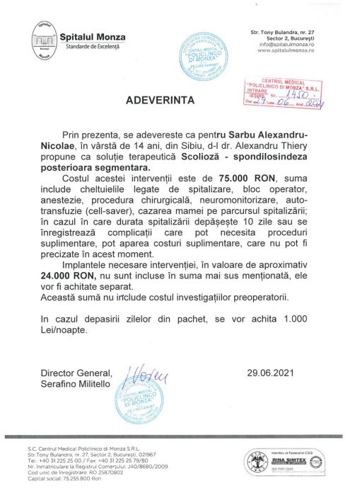 Scolioza lui Alex având la ora actuală un unghi Cobb de 88o şi se va realiza prin spondilosindeză posterioară T2 – S2 AI robotică.